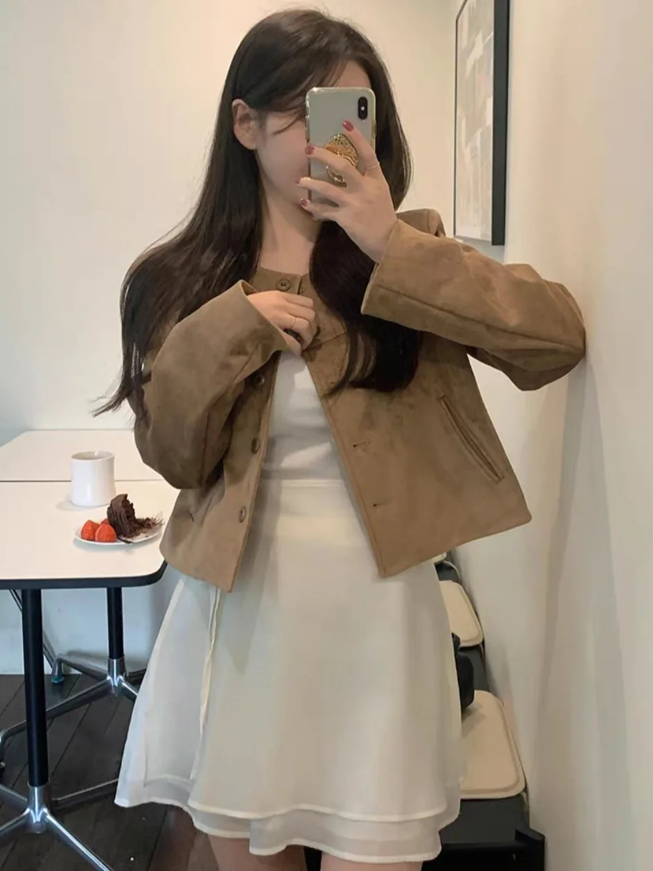 ↑Jaqueta Retro de Camurça com Botão Único para Mulheres, Estilo Casual de Primavera, Outono e Inverno, Espura Regular - TopDealBoxJaqueta de couro real feminina, casaco de pele de carneiro, corta-vento, clássico, clarete, lapela grande, ombro largo, ultracurto, luxo, designer, outono
