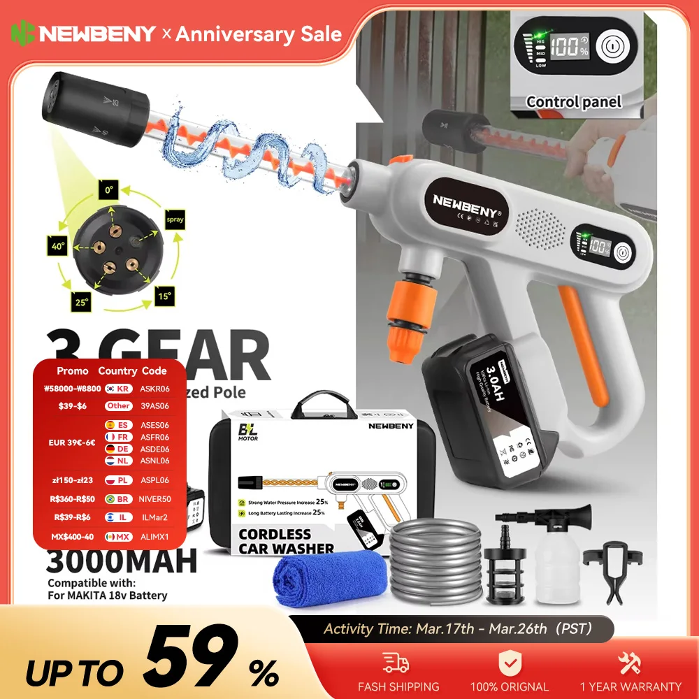♡Quick viewNewbeny 220bar 5 em 1 sem escova lavadora de alta pressão 3 engrenagens sem fio ferramenta limpeza do jardim do carro doméstico para makita 18v bateria511.50 BRLHot★★★★★★4.5