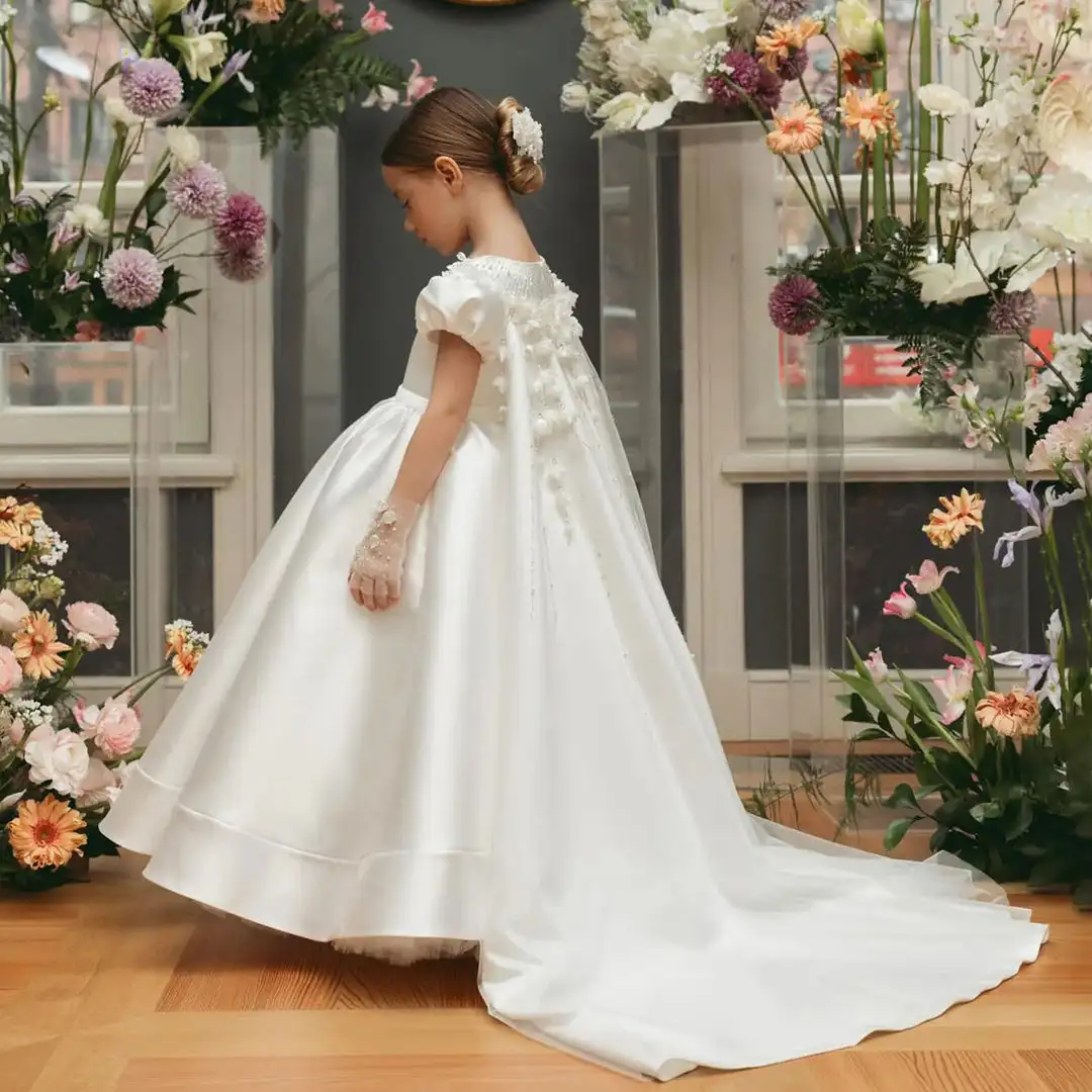 Vestido branco personalizado para meninas, mangas de joias, contas de cristal brilhantes, saia de cetim até o chão, vestido de casamento - TopDealBox